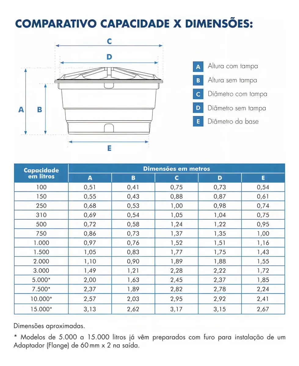 Caixa d’água indicada para armazenamento de água potável em residências e estabelecimentos comerciais. Fabricada em polietileno de alta resistência, com proteção contra raios UV.