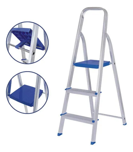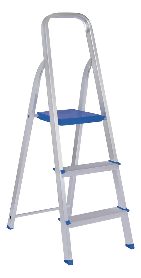 Escada de alumínio de 3 degraus, MOR. • Altura da plataforma, terceiro degrau: 63 cm. • Altura total da escada fechada: 1,17 metros. • Peso máximo: 120 kg. • Estrutura de bico de alumínio reforçado que oferece maior estabilidade • Plataforma de polipropileno de alta resistência com segurança • Degraus antiderrapantes com fenda • Leve: 2,4 kg • Dobrável