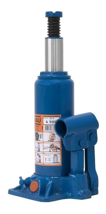 Macaco hidráulico tipo garrafa com capacidade de carga de até 4 toneladas, indicado para uso automotivo e utilitário em operações de elevação de veículos. Desenvolvido para atividades de manutenção e troca de pneus, deve ser utilizado conforme as orientações do fabricante, em superfície firme e com os pontos de apoio adequados.